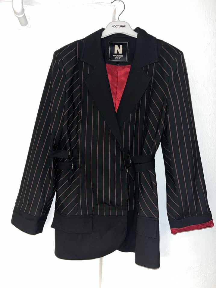Düğmeli, çizgili siyah kadın blazer ceket, normal kesim ve askılı kollara sahiptir. Midi boyda, iş ortamına uygun klasik bir modeldir.