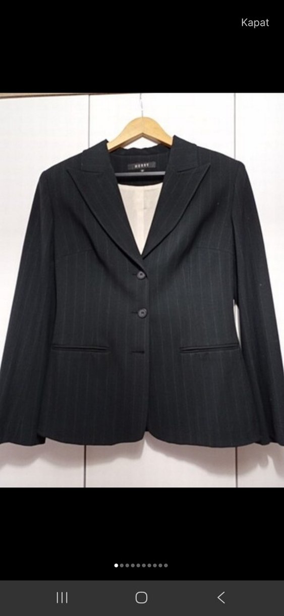 Düğmeli, siyah çizgili kadın blazer ceket, klasik yaka ve uzun kollu tasarıma sahiptir. Sentetik kumaştan üretilmiş, normal kesim ve midi boydur.