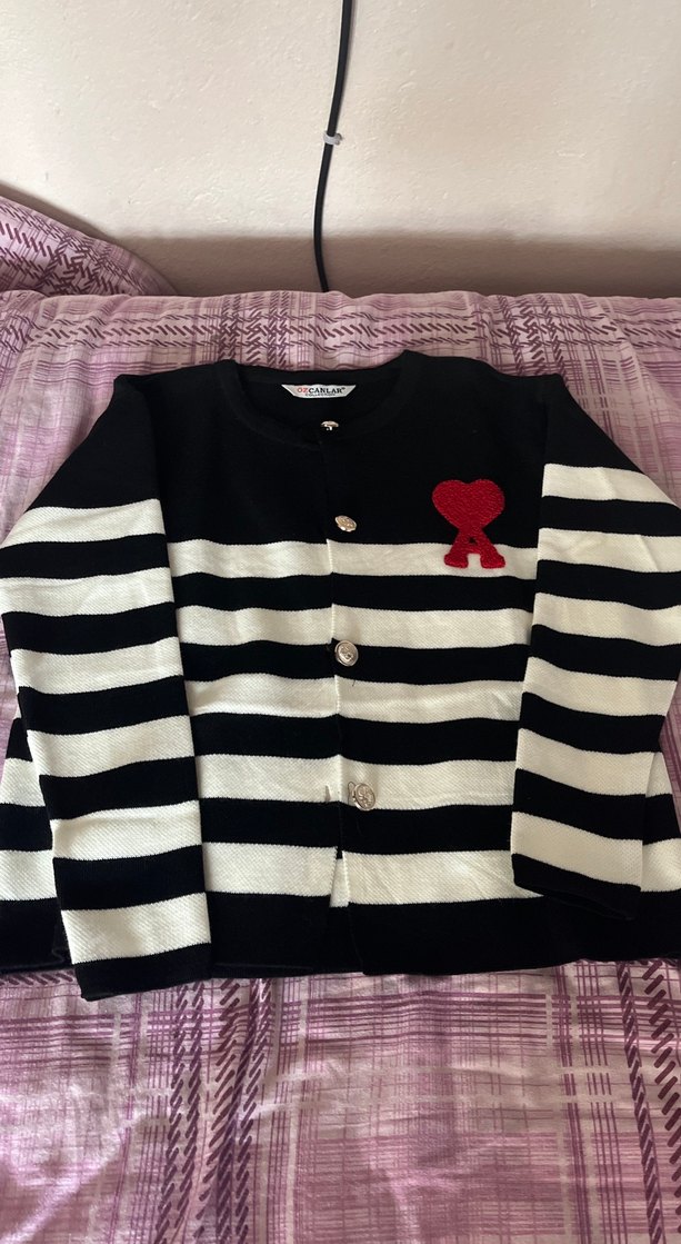 Düğmeli, uzun kollu, siyah ve beyaz çizgili, kalıplı örme kadın hırka. Kırmızı kalp detayıyla günlük kullanıma uygun şık parça.
