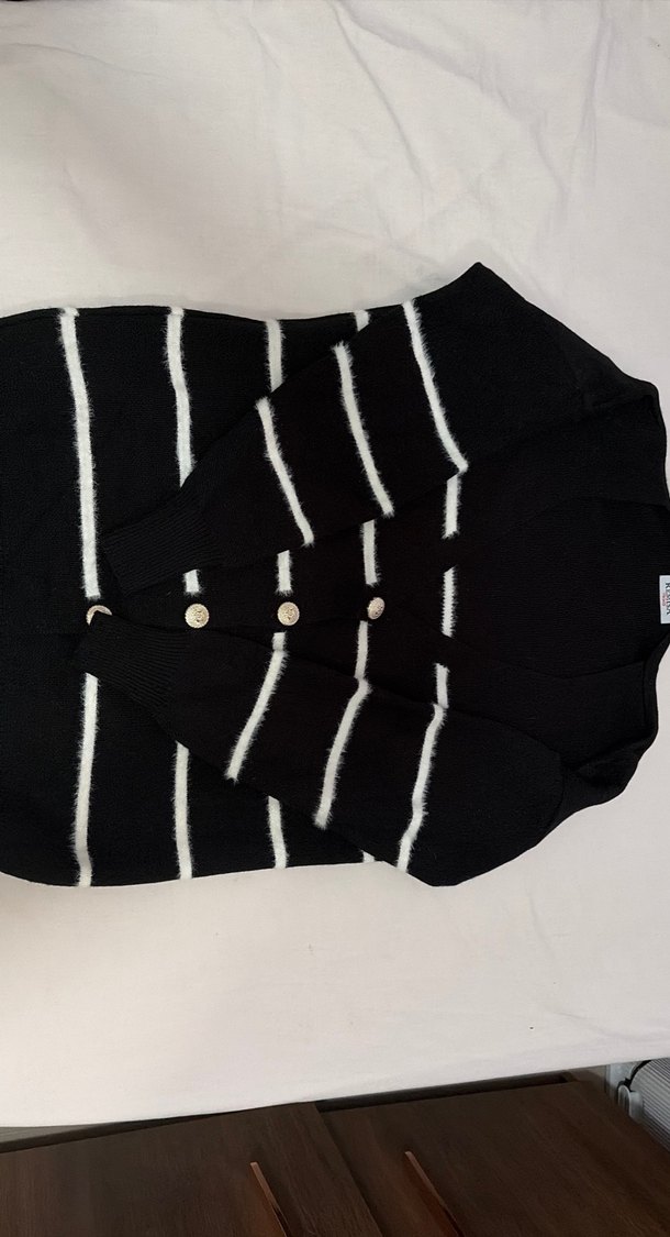 Düğmeli, uzun kollu, tekne yaka siyah beyaz çizgili yün kadın hırkası. Rahat dokusu günlük kullanım için uygundur. #hırka #siyah