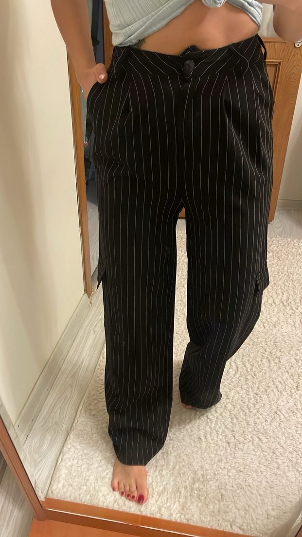 Düğmeli, siyah kumaş pantolon, ince çizgili ve normal kesim. Midi boyda, günlük sokak ve iş tarzına uygun.