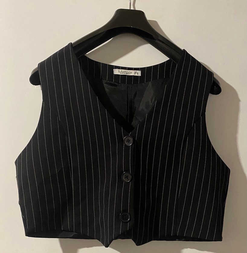 Düğmeli, siyah çizgili, kolsuz yelek.