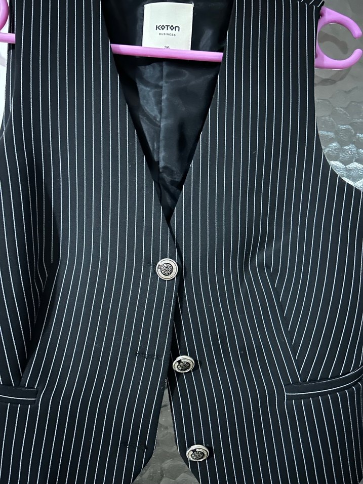 Düğmeli, siyah çizgili, kolsuz ve normal midi boyda kadın yelek. Ofis için uygun, gotik tarzda şık bir parça. Hiç giyilmedi sadece etiketi çıkardım yeni ürün