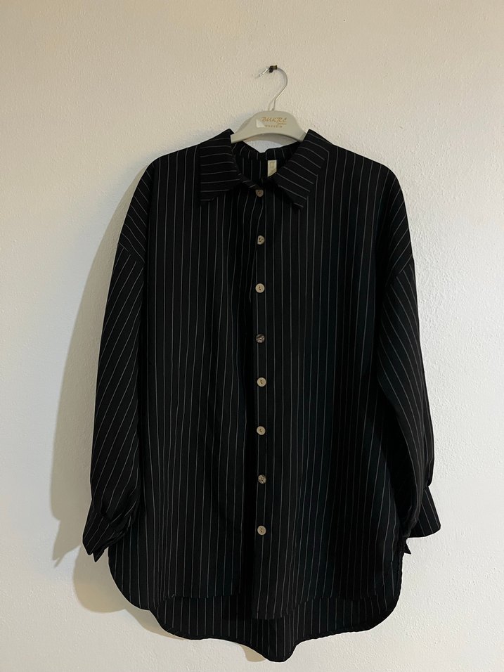 Siyah keten gömlek, uzun kollu, düğmeli ve kesik yaka detaylıdır. Çizgili deseni ve bol kesimiyle ofis ve günlük kullanıma uygundur.