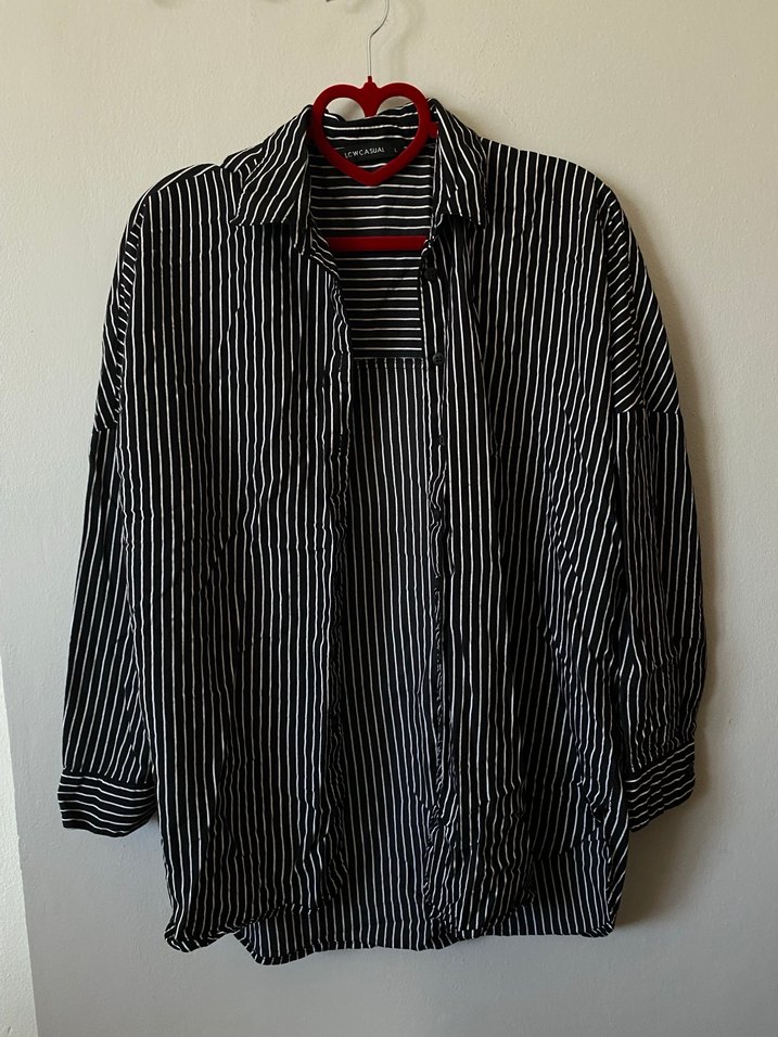Düğmeli, uzun kollu, siyah keten gömlek, kolyeli yakaya ve bol kesime sahiptir. Çizgili deseniyle rahat ve şık bir görünüm sunar.