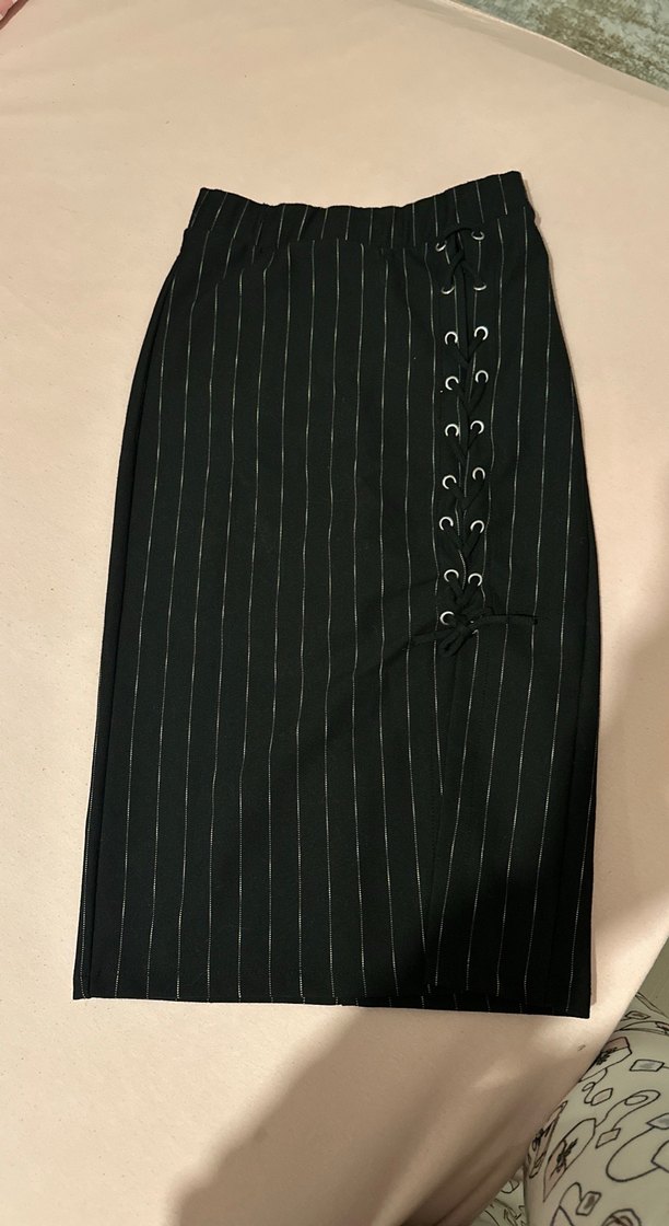 Dikey çizgili siyah midi kalem etek, düğmeli bağcık detaylarıyla ve regular fit kesimiyle ofis için uygun gotik tarzda.