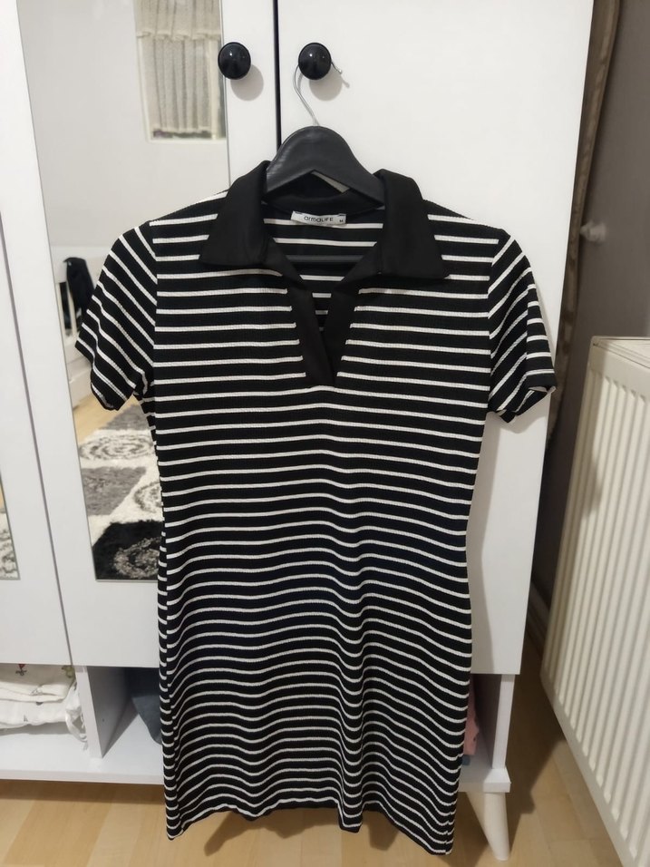 Düğmeli, kısa kollu, yakalı ve siyah beyaz çizgili desenli dar kesim mini elbise. Rahat sentetik kumaştan, günlük sokak stili için uygun.