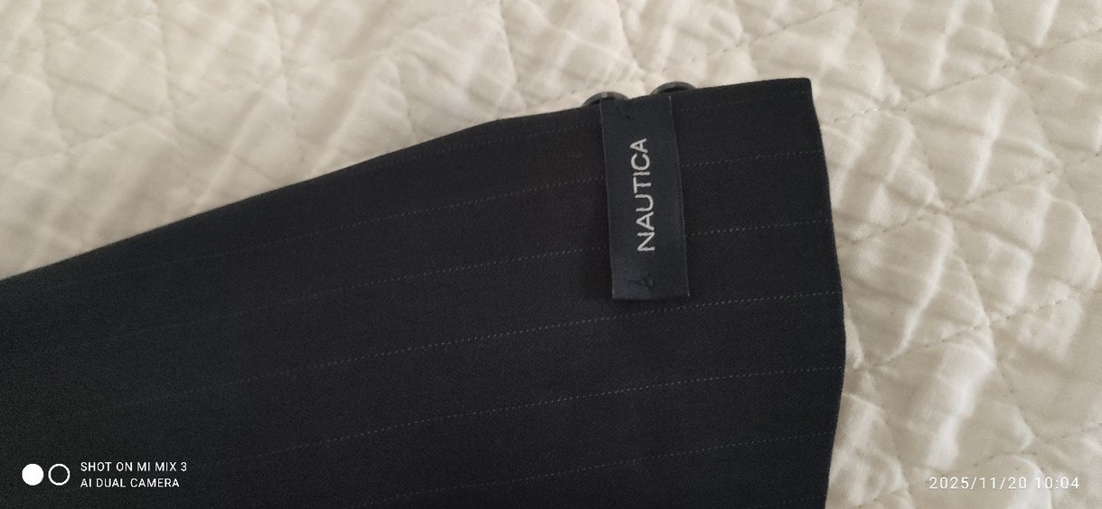 Düğmeli, siyah çizgili tuxedo ceket; kesik yaka, askılı kollu, normal kesim ve midi boydadır. Ofis ve iş ortamları için uygundur. Marka: Nautica.