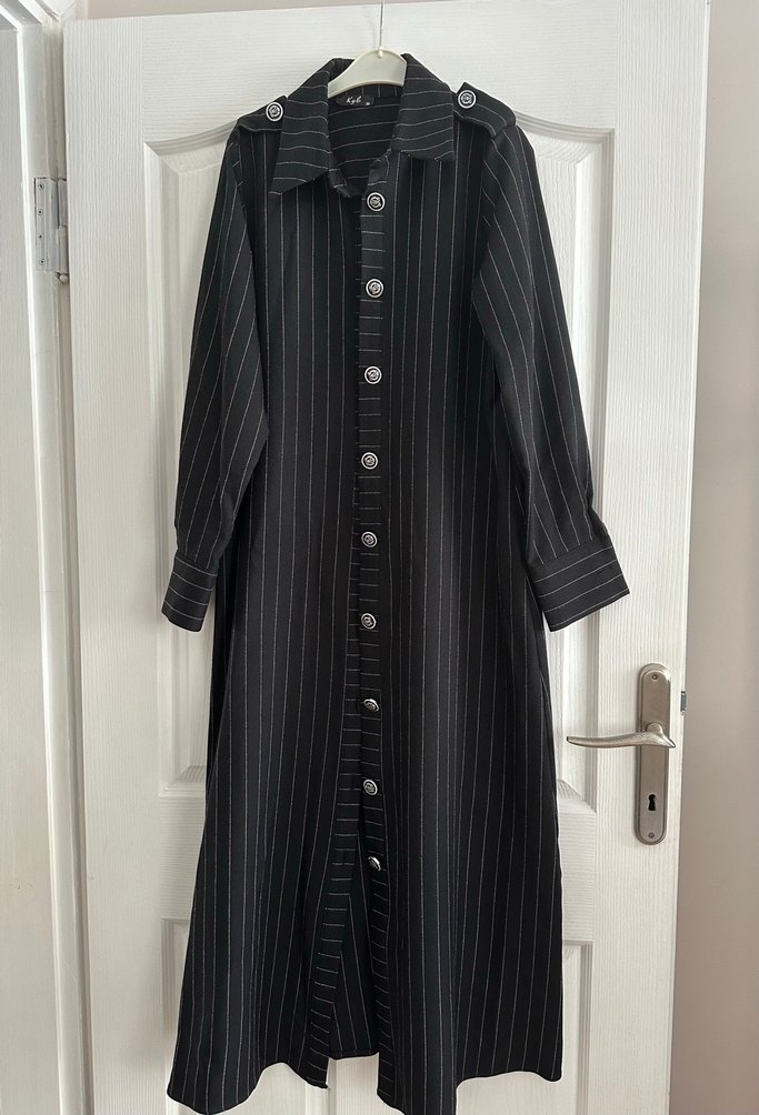 Siyah çizgili uzun elbise, düğmeli ön ve kesimli yaka ile. 38 bedendir