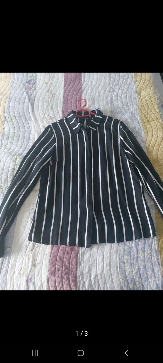 Düğmeli önü ve yakalı siyah gömlek, uzun kollu ve dikey çizgili. Regular kesim ve midi boy, yumuşak sentetik kumaştan.koltuk altından eni 47 cm boyu 62 cm