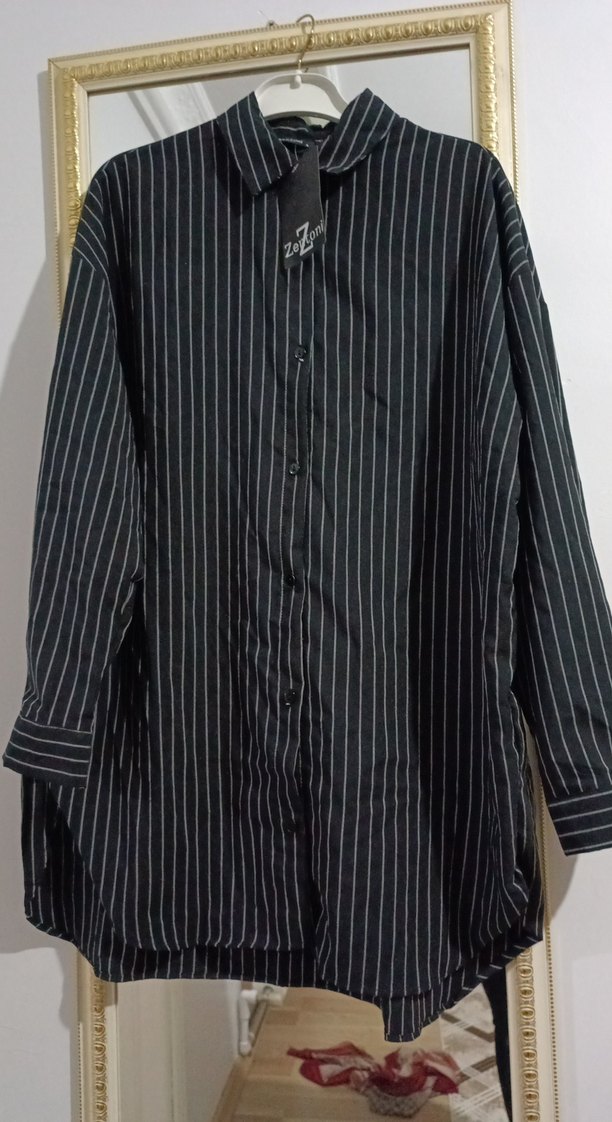 Düğmeli, uzun kollu siyah gömlek, çizgili ve keten kumaştan, bol kesim ve yaka detayı ile günlük rahat kullanıma uygundur.