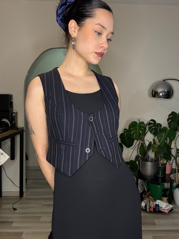 Düğmeli, V yakalı, siyah çizgili ve kolsuz bu yelek, normal kesimiyle ofis kullanımına uygun gotik tarzda tasarlanmıştır. Ortasında bi düğmesi yok