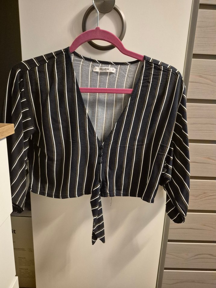 Düğmeli, uzun kollu, V yakalı ve siyah çizgili kısa, fitted gömlek. Ön kısmı bağlamalı, sentetik kumaştan, günlük kullanım için uygun.