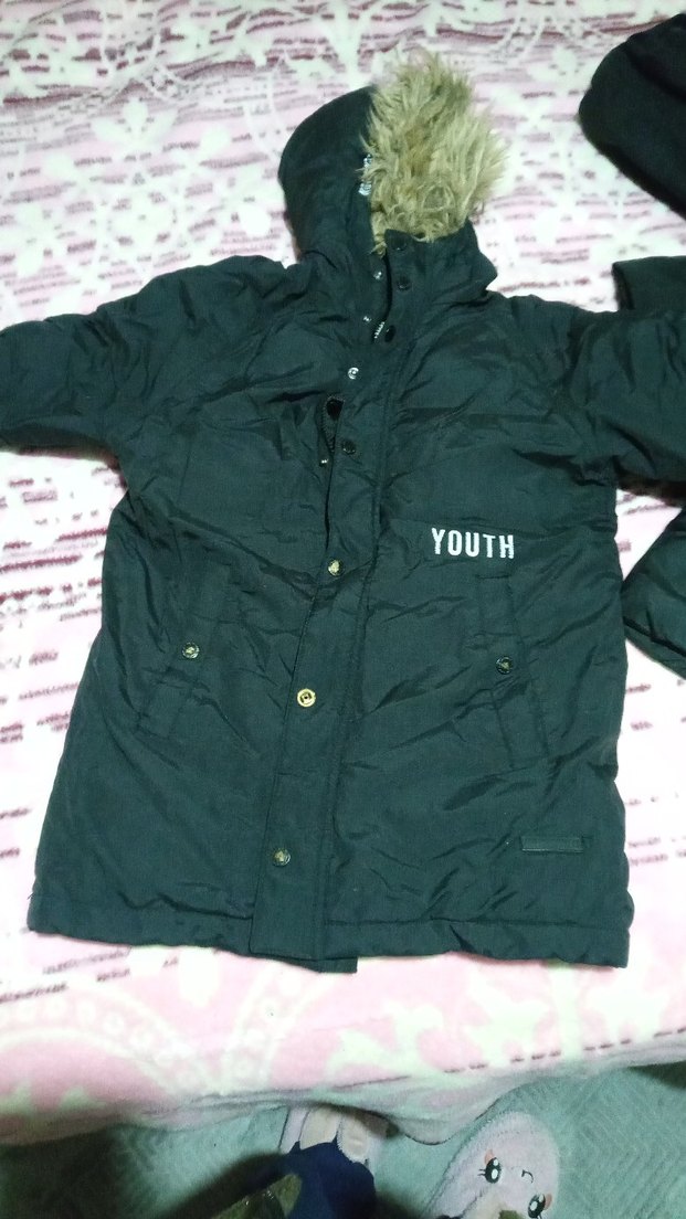 Düğmeli, notched lapel yakalı, dar kesim siyah çocuk mont. Sentetik kumaştan, "YOUTH" baskılı ve sokak stilinde.