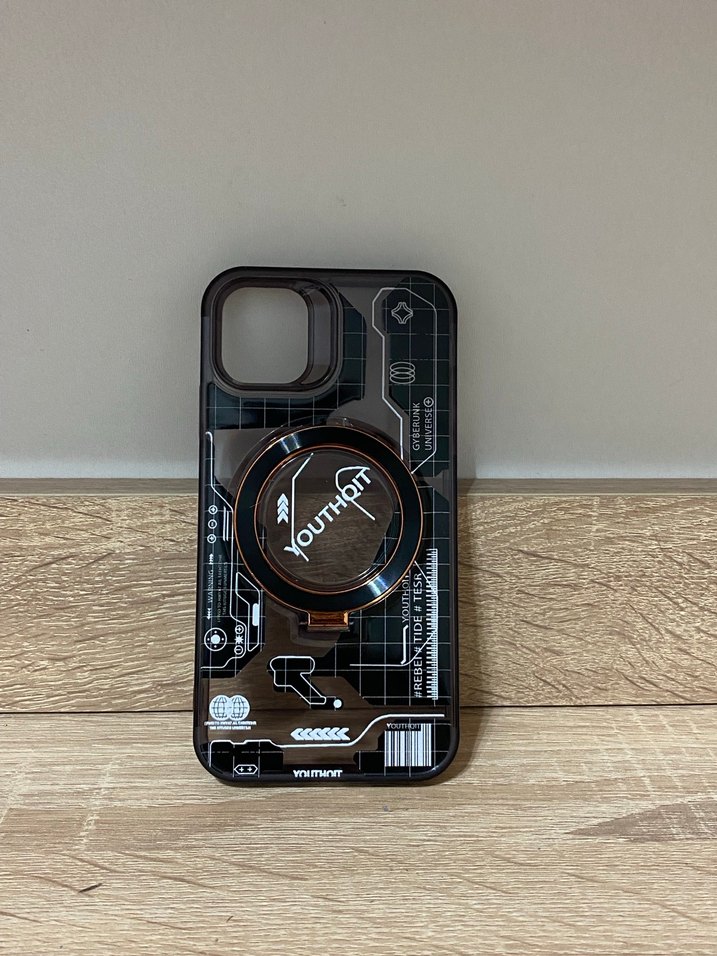 Düğmeli tasarıma sahip siyah telefon kılıfı, koyu counterculture stilinde ve arkasında yuvarlak tutacak bulunur.