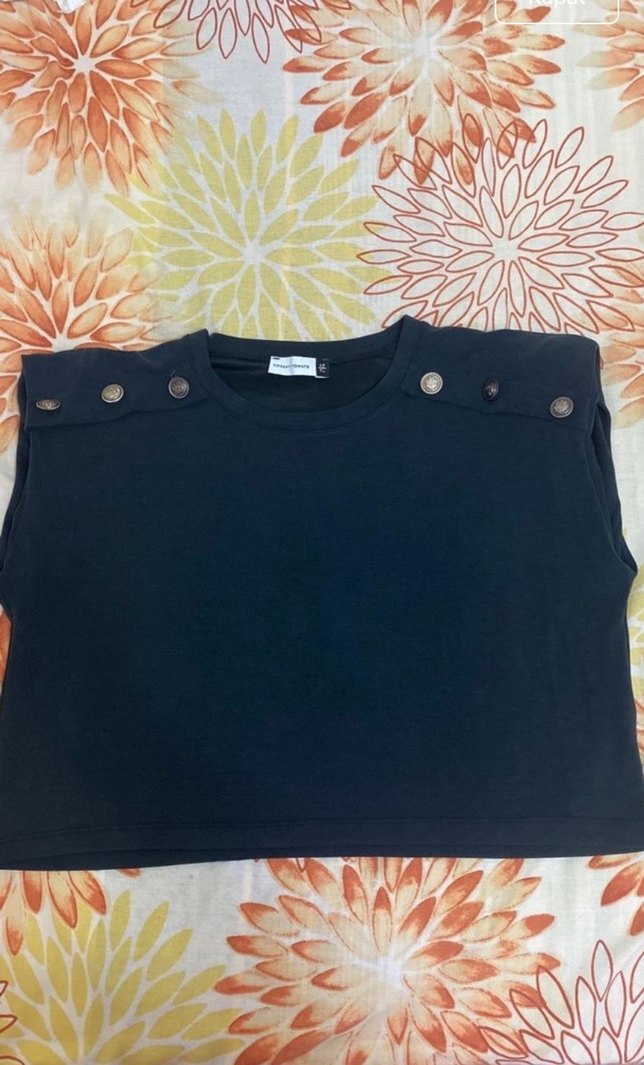 Düğmeli, kısa kollu, yuvarlak yakalı siyah crop top. Omuzlarda düğme detayları bulunan, rahat kesim bir parça.