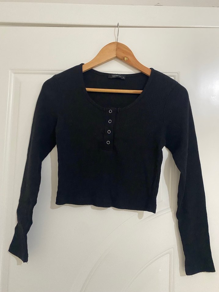 Fitted kesim, uzun kollu siyah crop top. Pamuk kumaştan, düğmeli ve yuvarlak yakalı. Minimalist goth tarzında günlük kullanıma uygun.