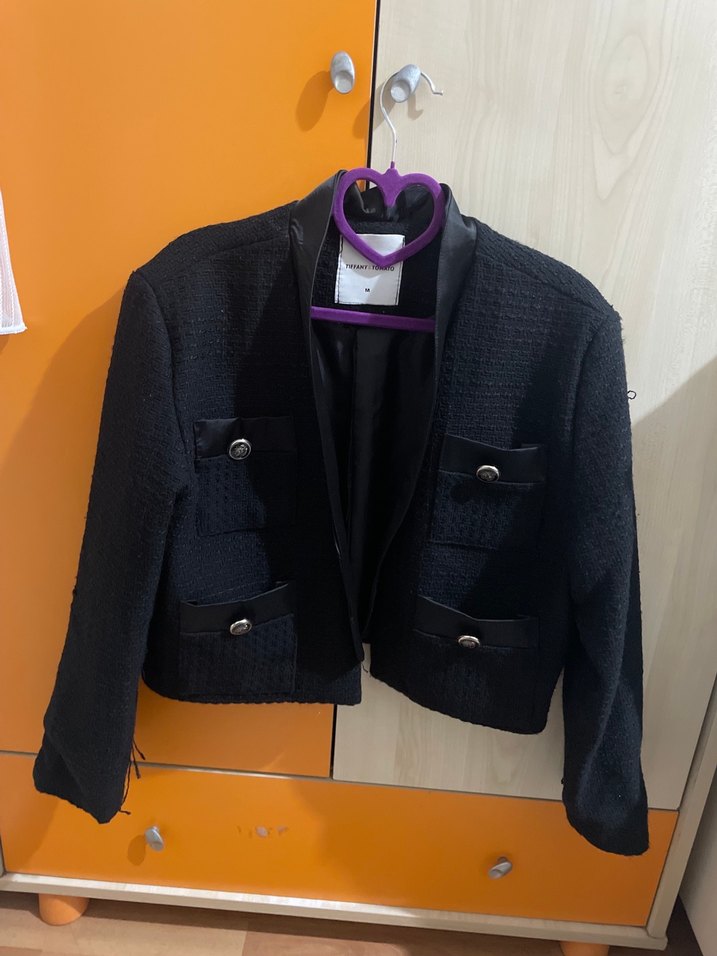 Düğmeli, siyah, kesimli ve baskılı desenli kadın blazer ceket crop boy. Sıfır ürün. etiketi yok sadece. Tifannny & tomato marka. Genis kalip. Crop giymedigim icin satıyorum :(