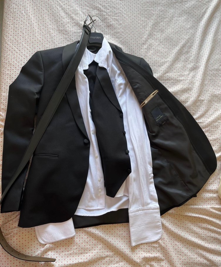 Düğmeli detaylara sahip, klasik kesim ve kesik yakalı siyah erkek takımı. Beyaz gömlek ve koyu renk, askılı kol kravat içerir. Yalnızca papyon taşınma esnasında kayboldu. 1 kez kullanıldı.