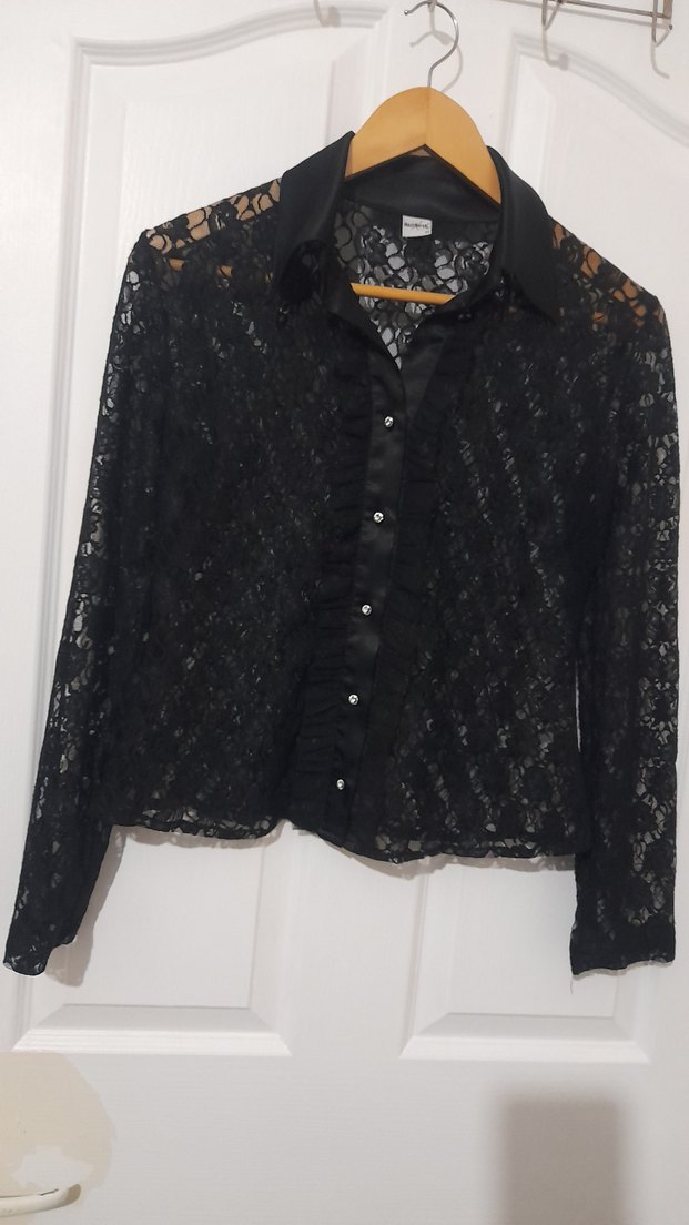 42 beden ama M L beden uygun. Düğmeli, uzun kollu, yakalı siyah dantel transparan gömlek.