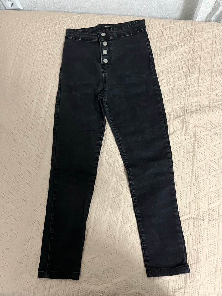 Düğmeli ön kısmı ve dar kesimi ile siyah kadın kot pantolon. Denim kumaştan, normal boyda, günlük sokak stili için uygundur.