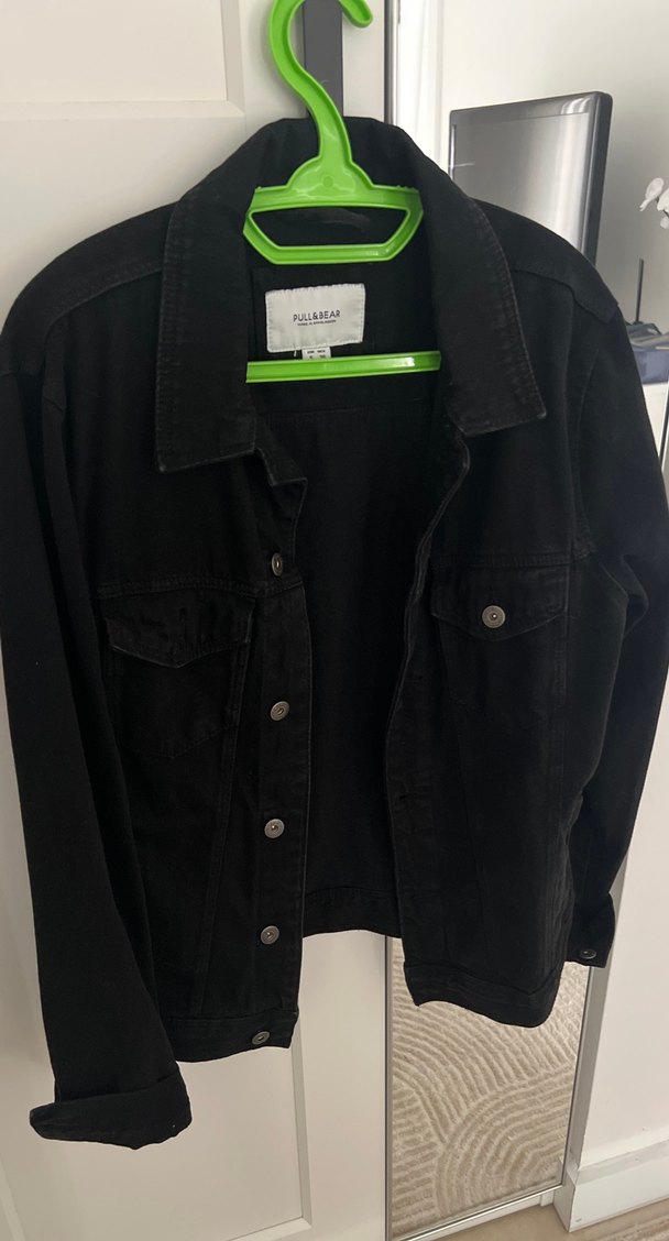 Düğmeli, siyah denim ceket, notched yakalı ve uzun kollu. Oversize kesim ve midi boyda, günlük rahat kullanım için uygundur.