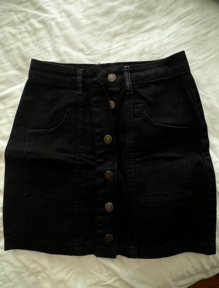 Düğmeli ön cep detaylı, siyah renk, fitted kesim denim etek. Günlük sokak stili için uygun, desensiz tasarım 1 kere giyildi