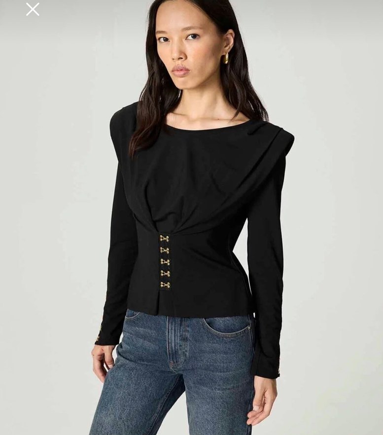 Düğmeli, V yakalı, uzun kollu siyah denim bluz. Fitted kesimiyle günlük ve ofis kullanımı için uygundur.