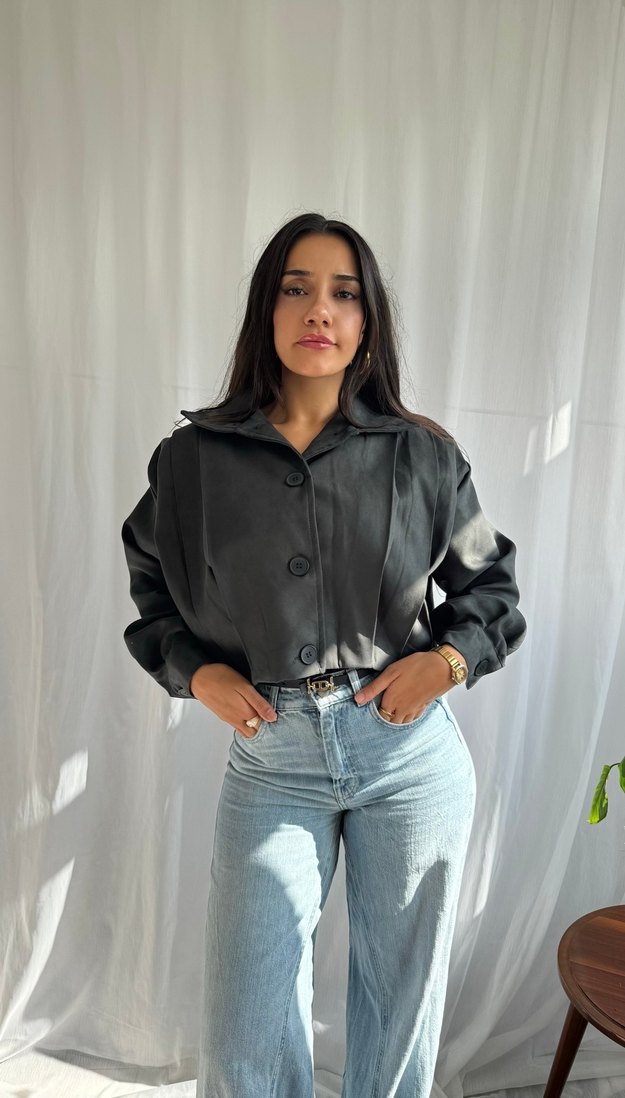 Bu siyah denim bomber ceket, uzun kollu, düğmeli ve yakalı tasarıma sahiptir. Salaş kesimi ve midi boyu ile günlük kullanıma uygundur.