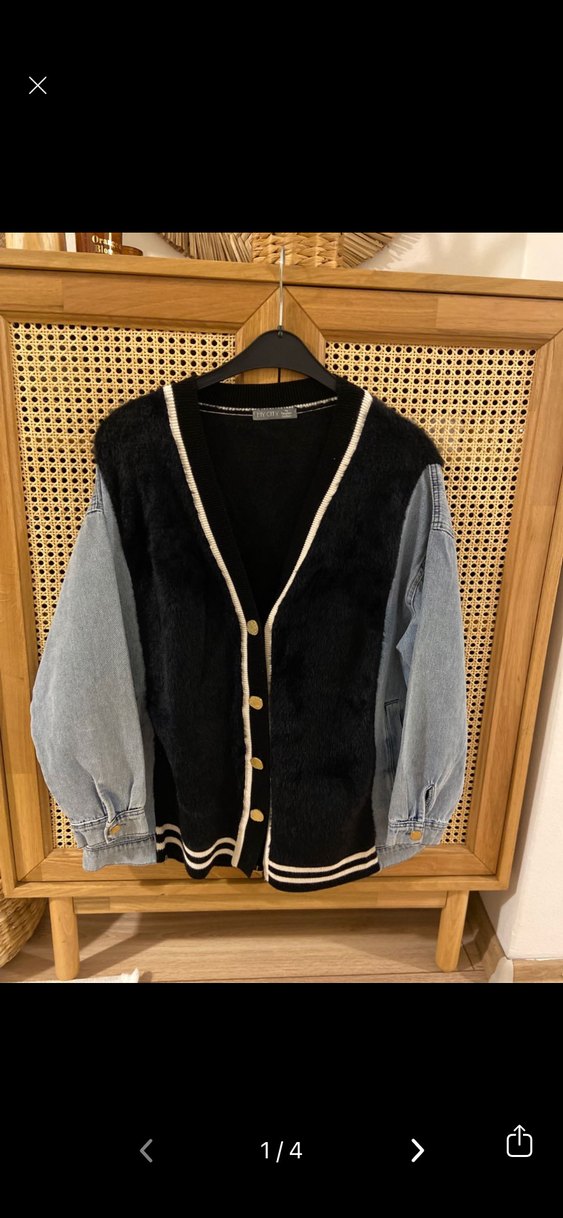 Kadınlar için düğmeli, siyah gövde ve kot kumaş uzun kollara sahip bol kesim ceket. Notched yaka detayıyla günlük sokak stiline uygundur.