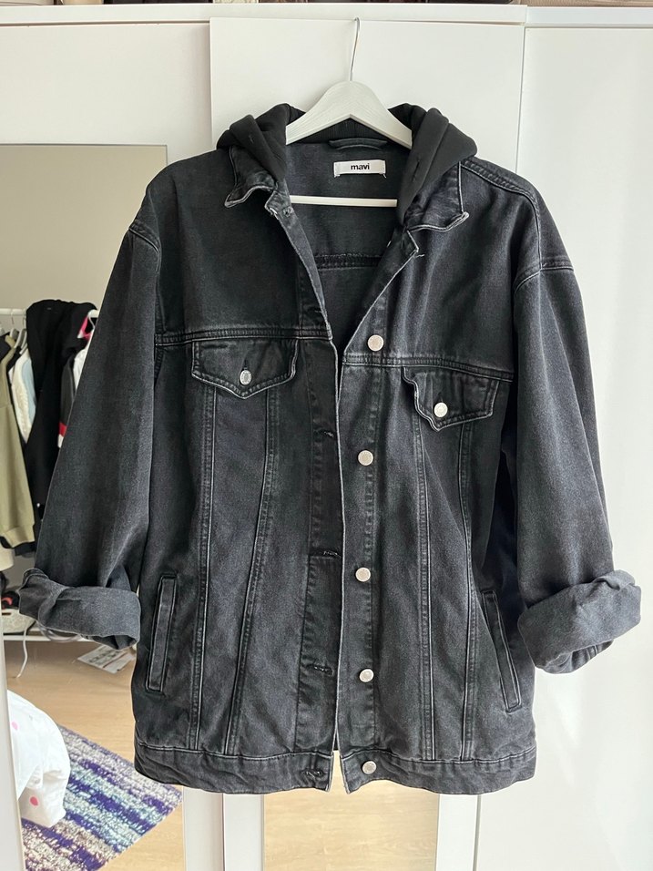 Düğmeli, siyah denim kadın ceket, bol kesim ve kesilmiş yakaya sahiptir. Uzun kollu ve günlük kullanım için uygundur.