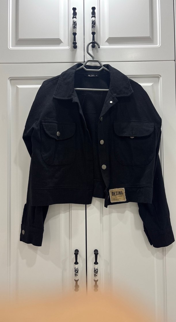 Düğmeli, siyah denimden yapılmış, normal boy ve salaş kesim kadın ceket. Uzun kollu, yakalı ve cep detaylıdır.
