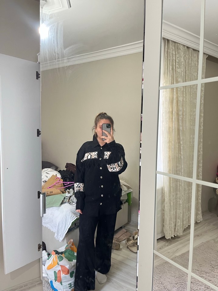 Uzun kollu, yaka detaylı siyah denim kadın takımı, bağlama desenli ve düğmeli, rahat kesim ve sokak stiline uygun. Hiç giyilmedi etiketli standart beden.