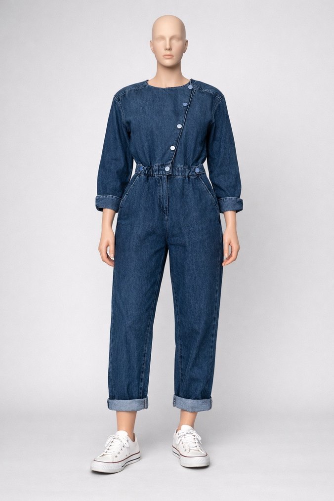Düğmeli ön kısmı, uzun kollu ve notlu yakalı lacivert denim tulum, mom kesim ve uzun boyda, minimalist günlük kullanım için uygundur. 36 beden yazıyor ama kalıbı geniş 38’e olur.