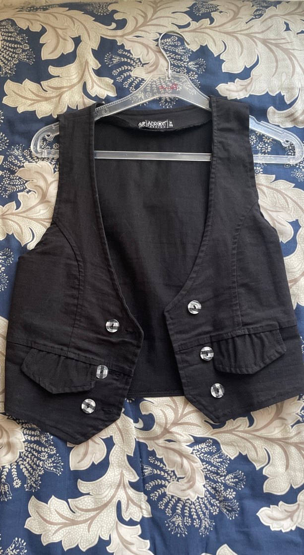 Düğmeli, siyah denim kumaştan yapılmış, notlu yaka ve vücuda oturan kesime sahip goth tarzı günlük kadın yeleği.