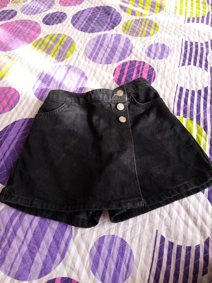 Düğmeli ön kısmı ve hafif batik desenli siyah denim, bol kesim kız eteği, trend sokak stili için uygundur.