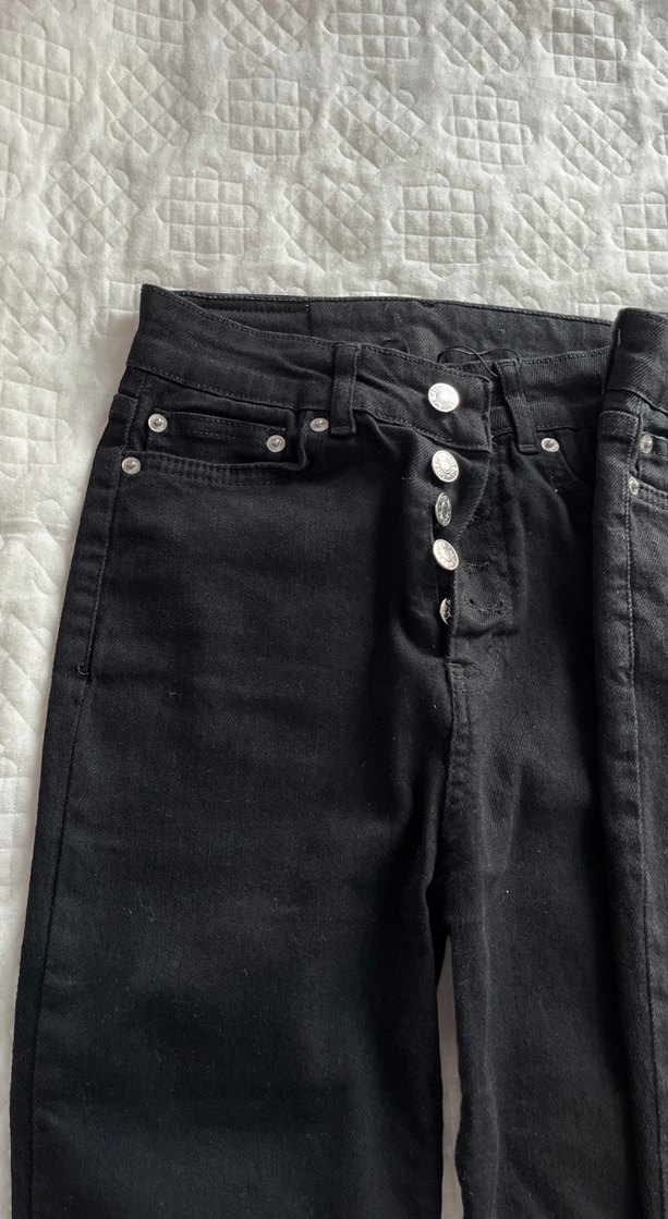 Düğmeli, siyah denimden yapılmış, midi boy ve normal kesim kot pantolon. Minimalist ve desensiz tasarım, günlük kullanım için uygundur. Hiç kullanılmamıştır.