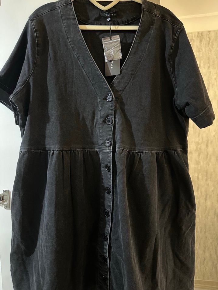 Siyah denim midi elbise, V yaka ve kısa kolludur. Düğmeli önde ve bol kesimdir, gündelik kullanıma uygundur.