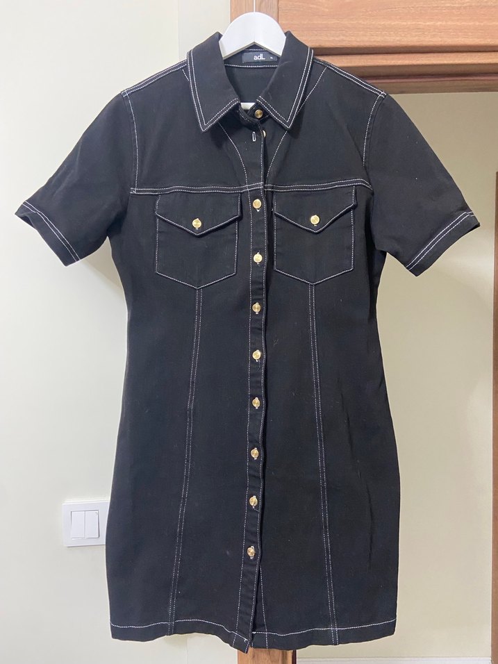 Bu siyah denim elbise, kısa kollu ve yakalıdır. Önü düğmeli, vücuda oturan kesimiyle günlük kullanıma uygundur.