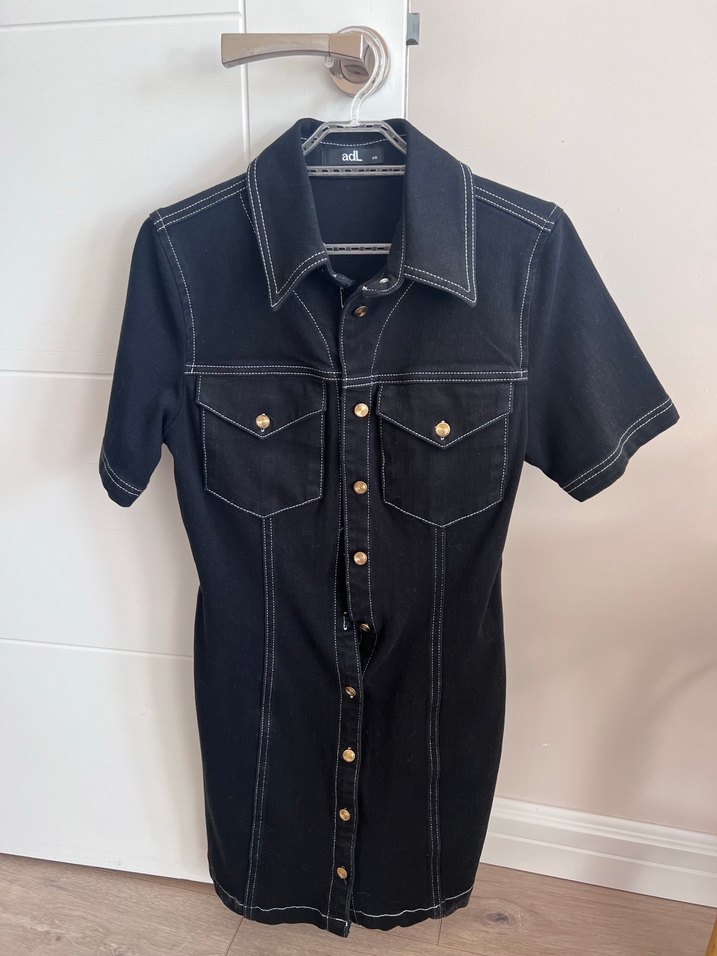 Düğmeli, kısa kollu, siyah denim midi elbise. Notlu yaka ve ön ceplerle trend sokak stiline uygun, vücuda oturan kesim.