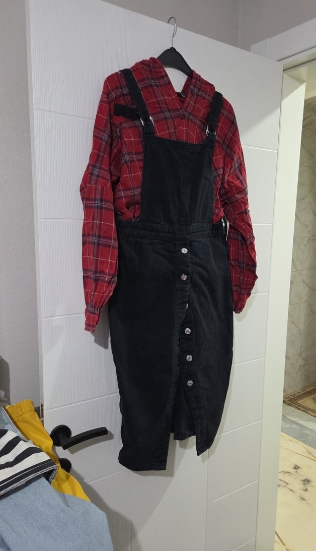 Düğmeli ve ayarlanabilir askılı siyah denim midi tulum, rahat kesimlidir. Kırmızı ekose gömlekle kombinlenebilir.