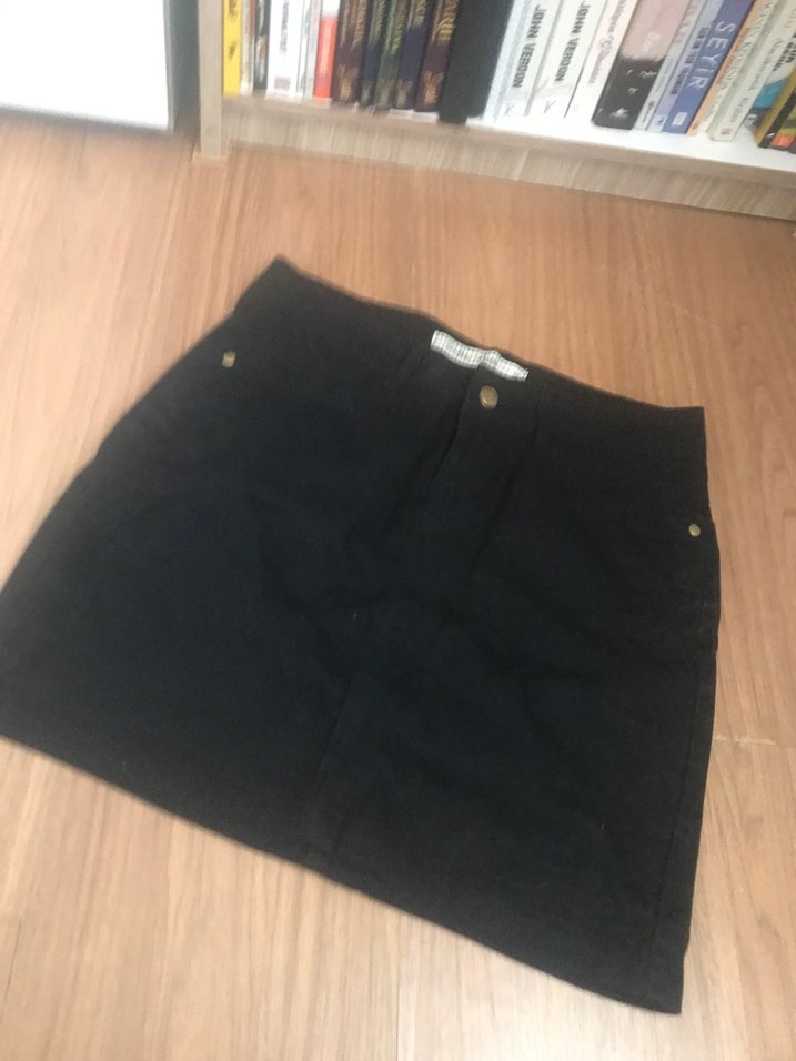 Düğmeli ön kısım ve sade tasarıma sahip, vücuda oturan siyah denim mini etek, trend sokak stili için uygundur. Üzerinde m beden yazılı ama s beden için uyumludur.