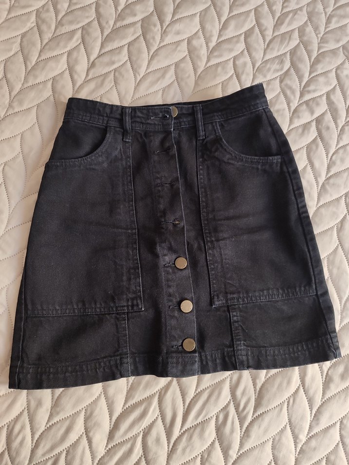 Düğmeli, siyah denim mini etek. Rahat kesimi ve ön cep detaylarıyla sokak stiline uygun, trend günlük kullanım için ideal.