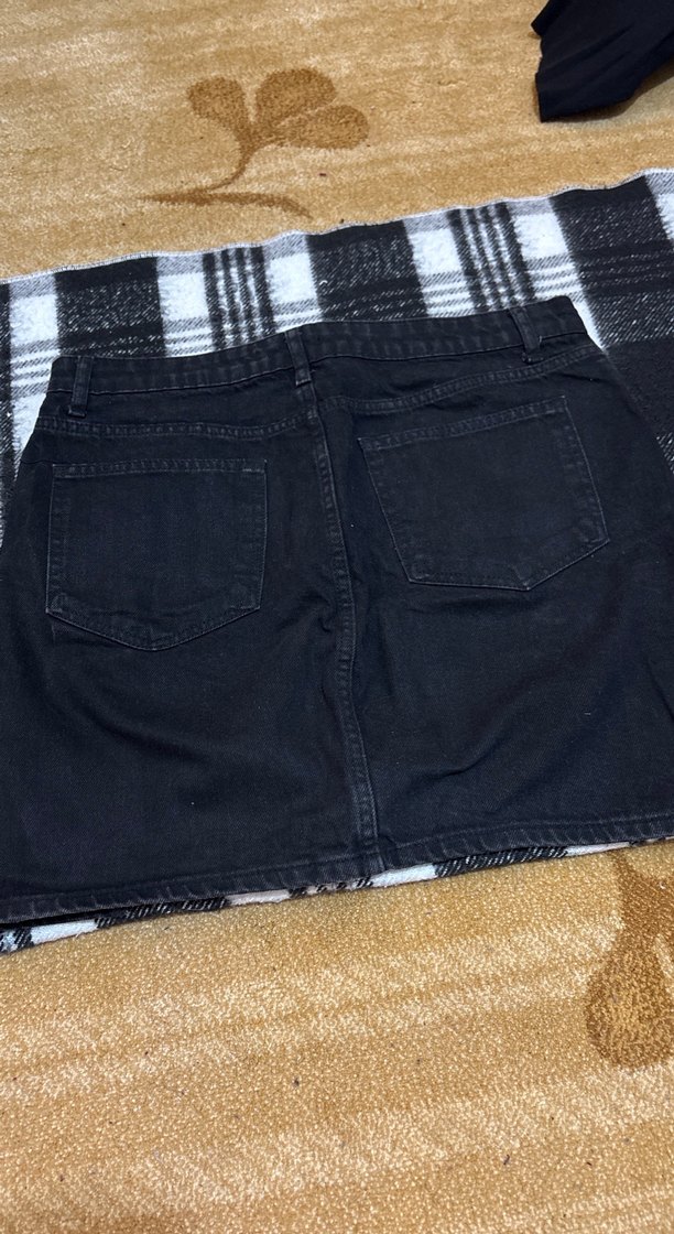 Düğmeli detaylara sahip siyah denim mini etek, rahat kesimiyle günlük sokak stiline uygundur. Normal uzunlukta ve desensizdir.