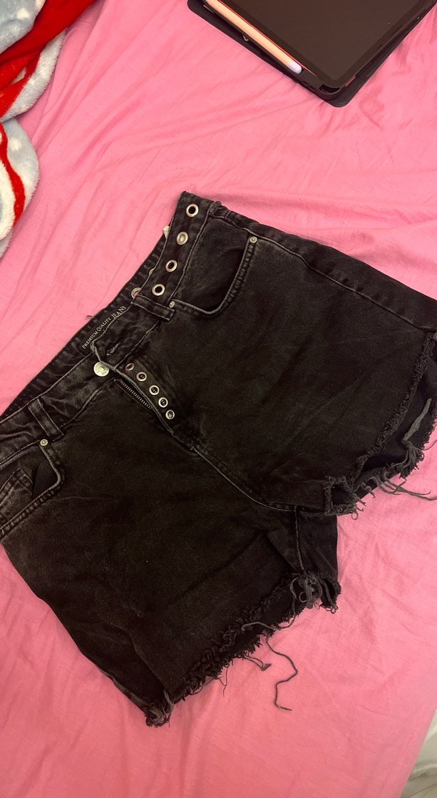 Düğmeli, siyah , bol kesim denim şort. Kenarları tırtıklı, grunge punk tarzına uygun, günlük kullanıma uygun goth havasında.