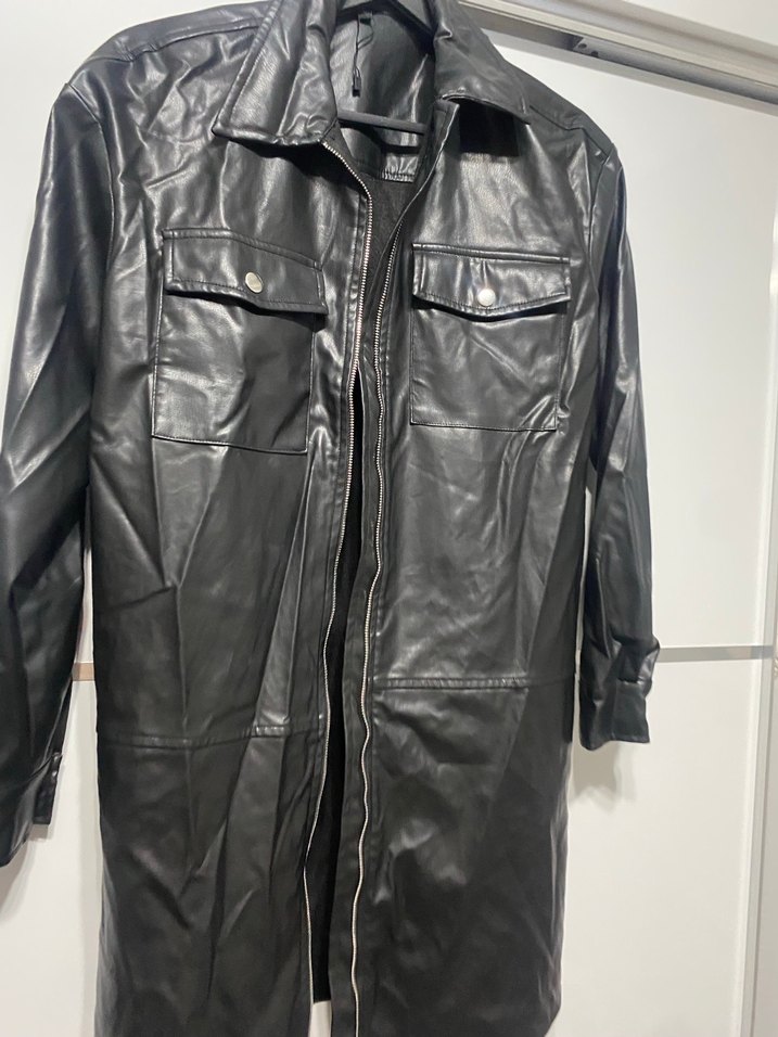 Düğmeli cep detaylı, uzun kollu ve kesimi vücuda oturan siyah deri biker ceket. Midi boyda, günlük ve sokak stiline uygun bir model.