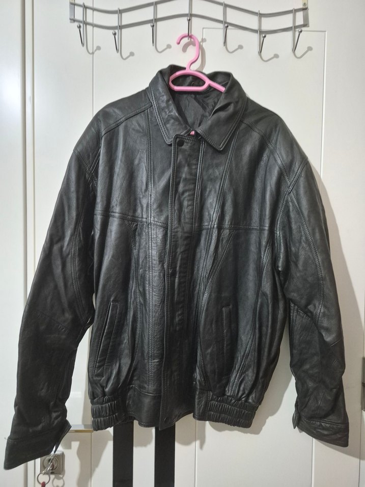 Düğmeli, siyah deri biker ceket, bol kesim ve normal boyda. Notlu yaka ve uzun kolludur, günlük kullanım için uygundur. Tamamen orijinal deridir. Babamdan kalan çok eski bir ceket. Herhangi bir kusuru yok tamamen fotoğrafta göründüğü gibi. Teklif yapabilirsiniz fiyat için. boyu 72 cm, iki kol arası yani genişliği 68 cm, kol boyu da 60 cm