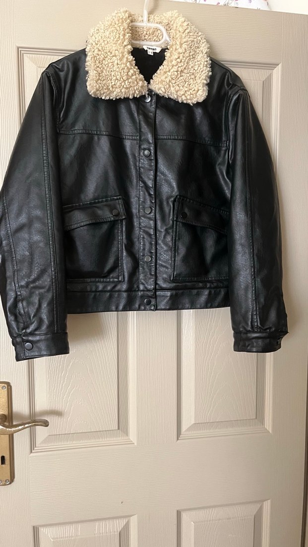 Düğmeli ön ve notched lapel yakalı siyah deri biker ceket. Açık renkli yumuşak kürk yakası ve günlük kullanım için normal kesim özellikleri bulunur.