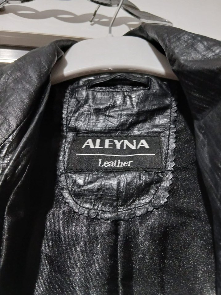 Siyah, düğmeli, notched lapel yakalı, baskılı ve askılı kollu, normal boy midi deri biker ceket. Sokak stiline uygun, sıkı kesim ve günlük kullanıma uygun.
