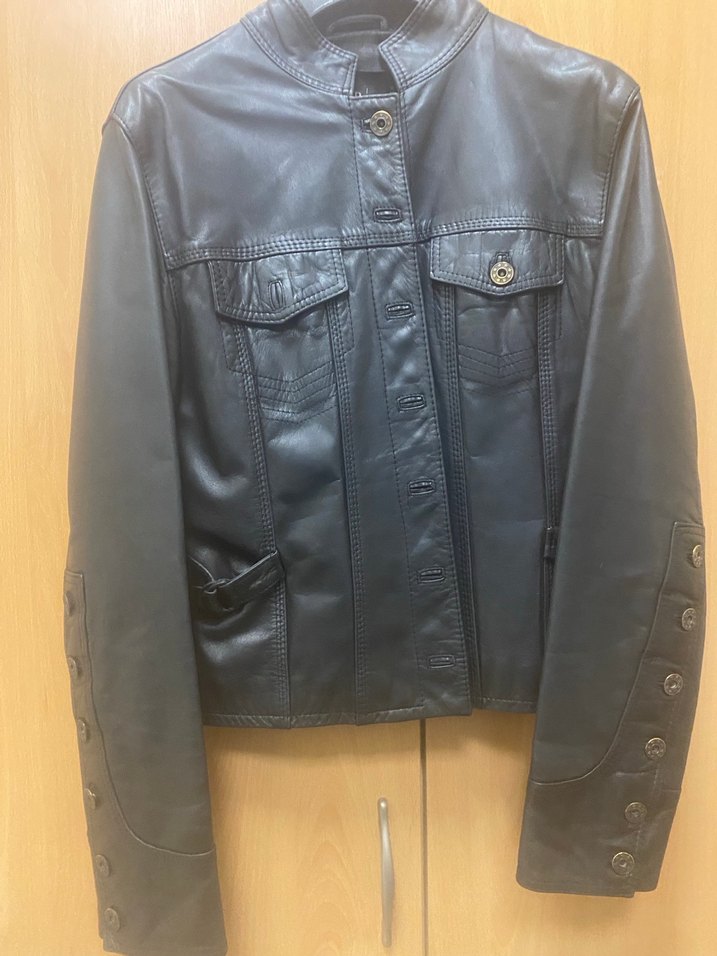 Düğmeli, uzun kollu, siyah deri biker ceket, notalı yakalı ve vücuda oturan kesimiyle trend bir günlük tarz sunar.